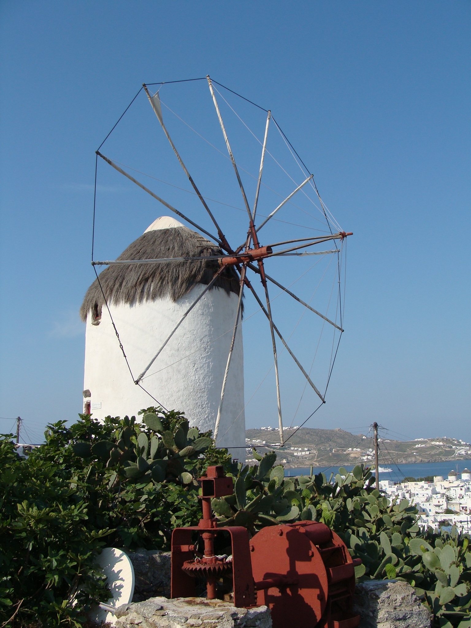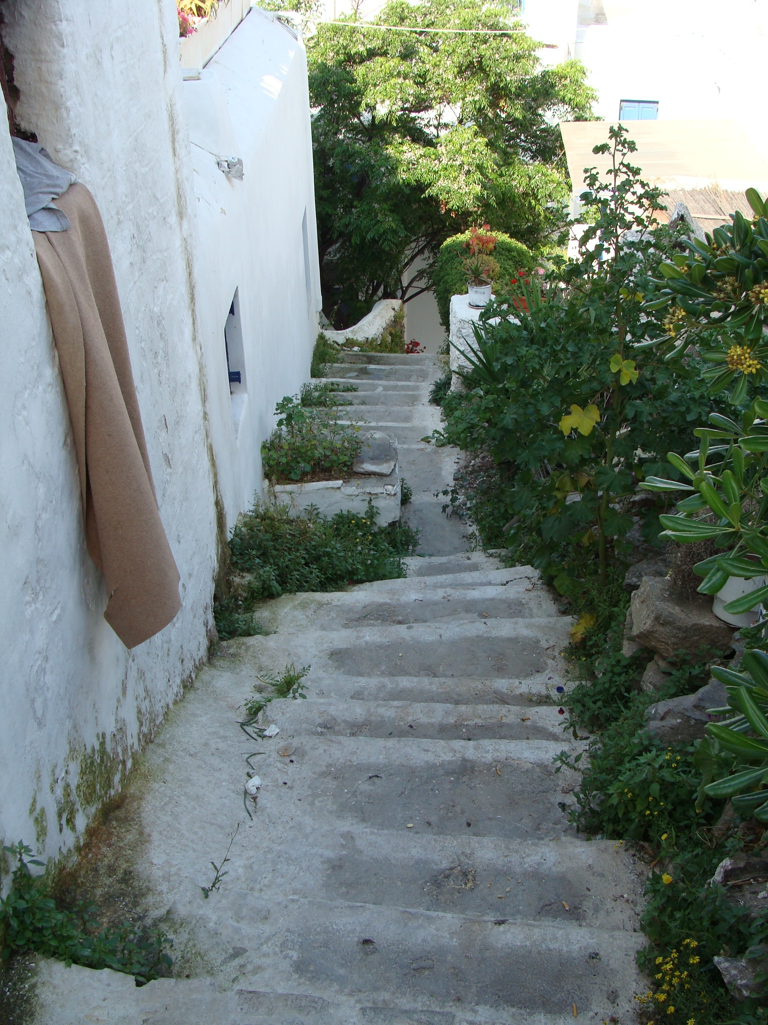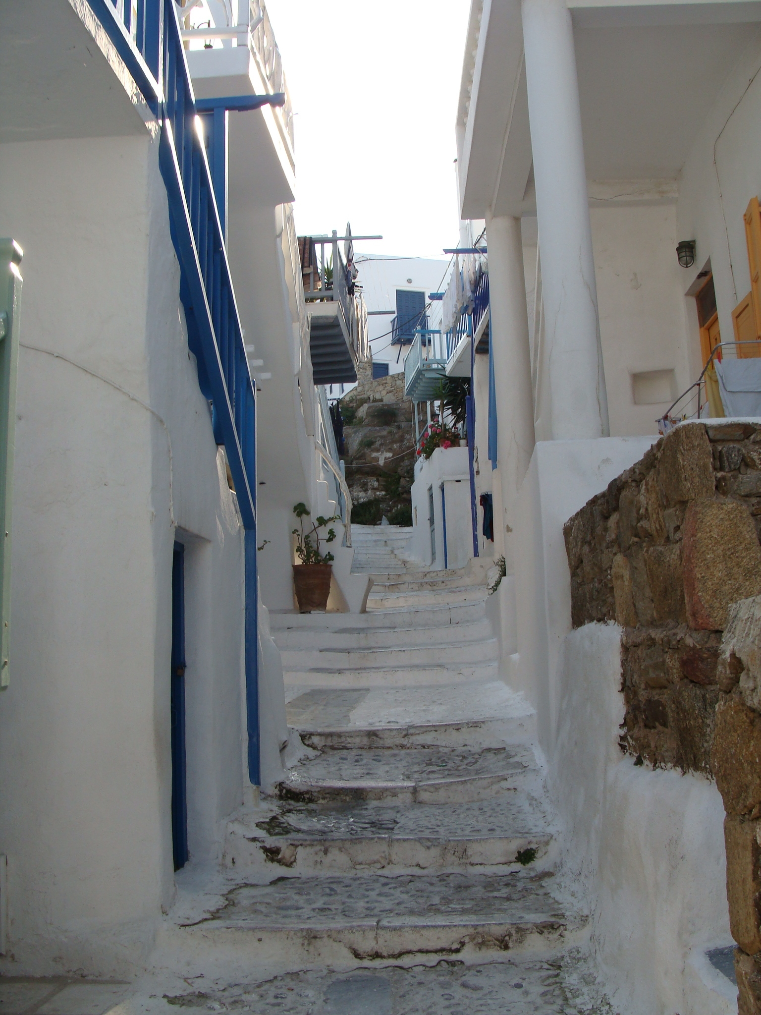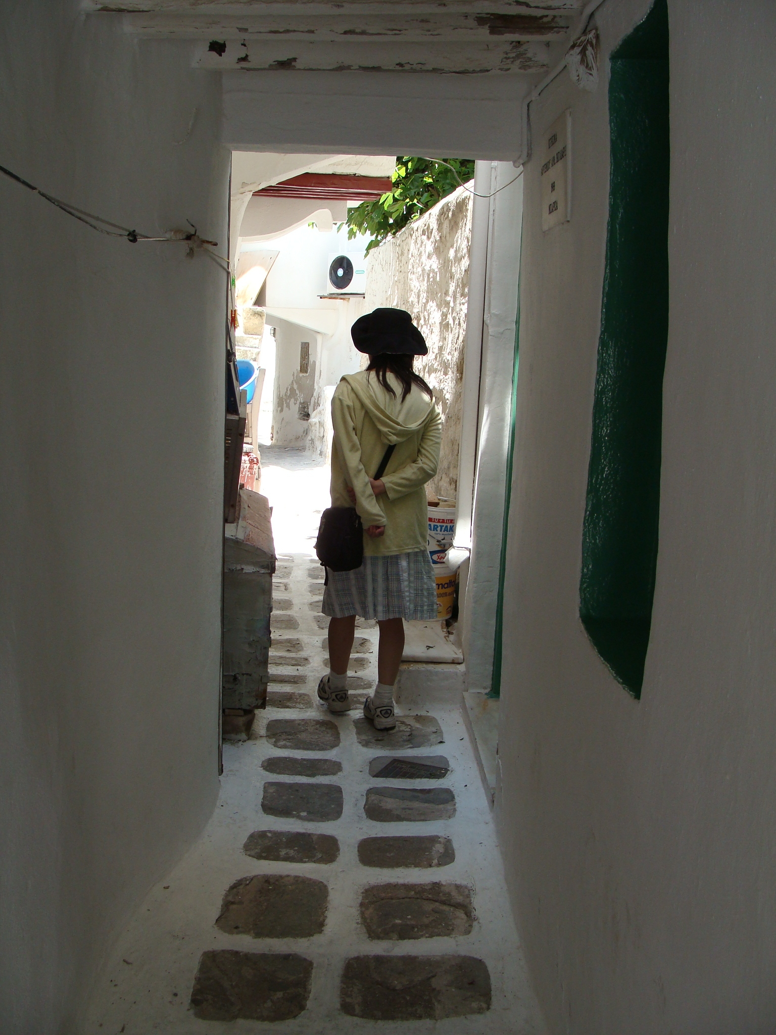 ミコノス島の中心地、ミコノスタウン。この小さな小さな観光の町は、アテネの旧市街と同じか、それよりさらに狭い路地でできている。裏原宿くらいの幅の普通の道から、肩幅二つ分には足りないくらい狭いところまで。区画整理がされていないので、直角がない。町が斜面に作られているので、階段が非常に多く、まるで迷宮のようだ。庭や垣根もない小さな家が寄せ合っているので、どこからが私有地で、どこからが公道なのか、はっきりしない。もしかしたら、全部私道だったりするのではないか。ふと気づくと、個人宅の中庭のような場所に入り込んでしまっていることさえある。