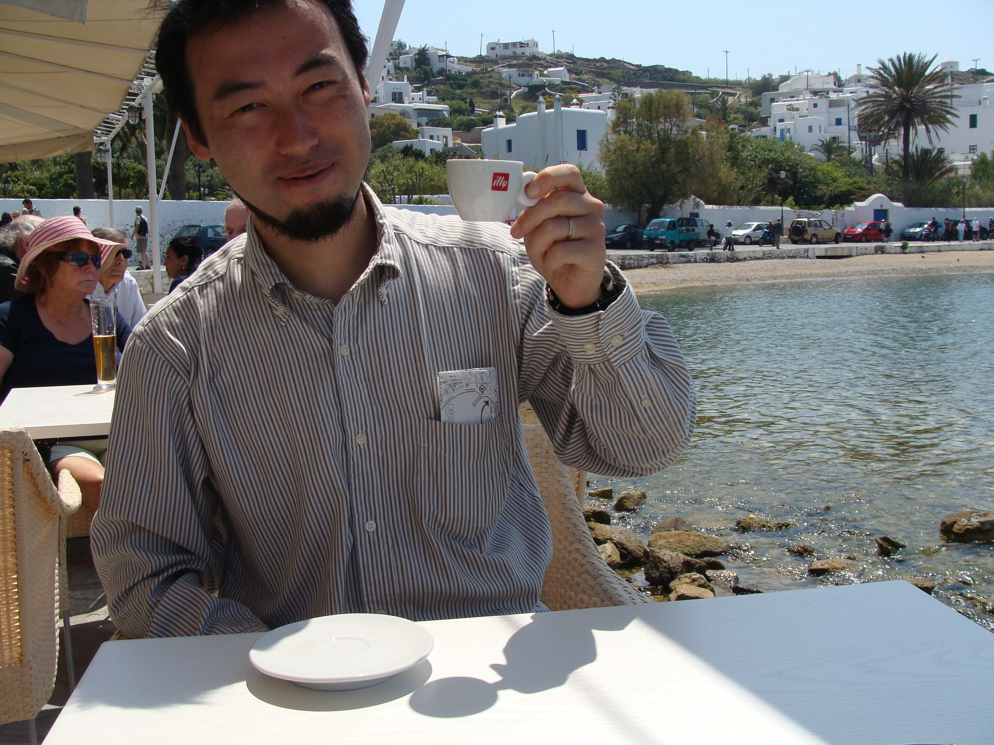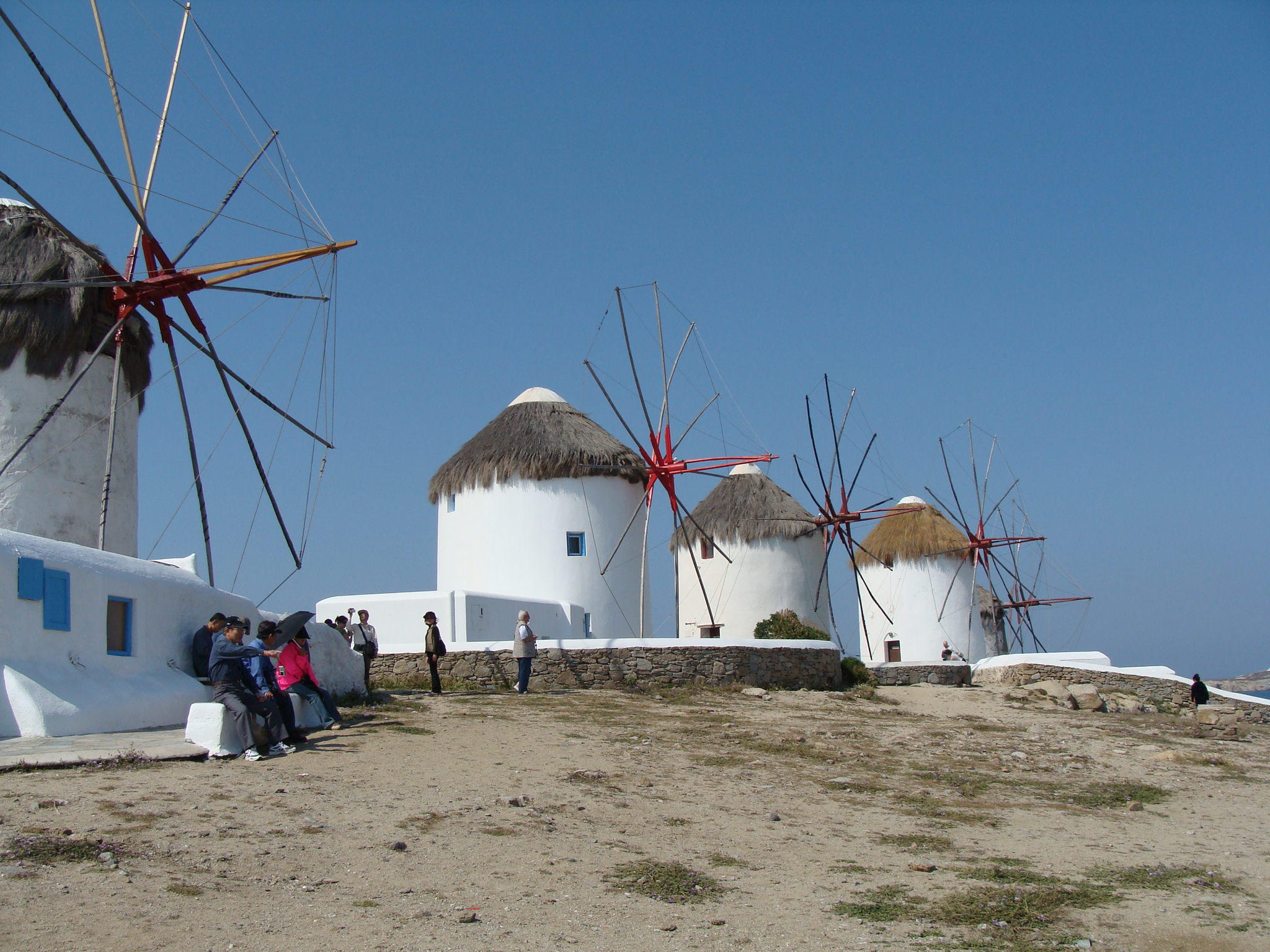 ミコノスタウンがアテネと大きく違っているのは、その白さだ。この町はどこもかしこも白い。家の壁や道をペンキで白く塗るのが伝統らしい。「白銀の世界」という言葉があるが、そんな感じだ。まるで町中に雪が積もったみたいに白いのだ。それでいて、太陽はまぶしく、さんさんと輝いていて暑い。永遠に白銀の町、それがこのミコノスタウンだ。あまりにまばゆくて、眼病の疾病率が高いのではないかと心配になるくらいだ。