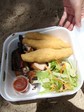 賭に勝ったので、カミさんが食事を買ってきてくれる。お店で頼んだら、ビーチまで持ってきてくれるとのこと。ジャークチキンとバミのセット、ジャークチキンとフェスティバルのセット、フルーツパンチ。どれも美味しかった。ジャークチキンはスパイシーなチキンで、チリソースを付けて食べる。バミはもちっとした食感の、ライスケーキみたいなもんだろうか。フェスティバルはドーナツ的なもの。